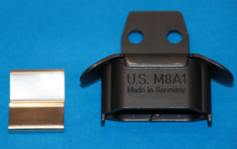 unbenutzt aus älterem Lagerbestand, Fassung + Blattfeder, passend für Bajonettscheide U.S. M8A1 und U.S. M8. Hersteller : Eickhorn, Solingen.