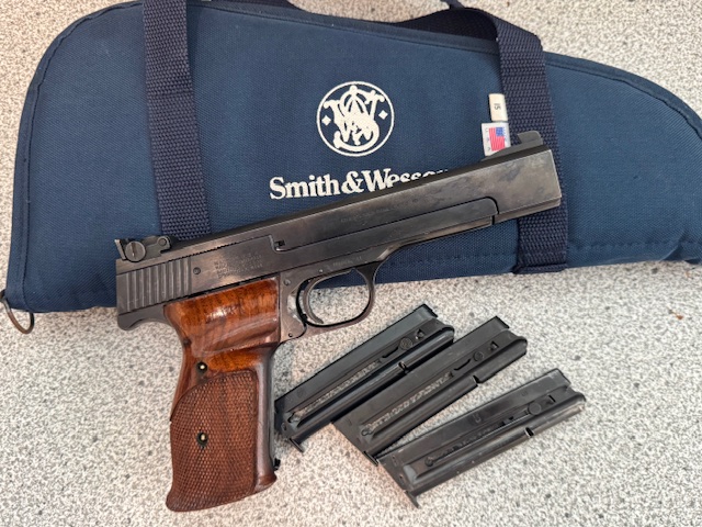Smith & Wesson 41 Sport Pistole, 10 Schuss Stangenmagazin, beliebte hochwertige Ganzstahlwaffe mit hervorragender, noch aus den 70igern bekannten Qualität und Verarbeitung. Signalstift zur Anzeige ob der Hahn gespannt ist. 1970g Gewicht. Verstellbares Micro Meter Visier und 3,2mm Balkenkorn.