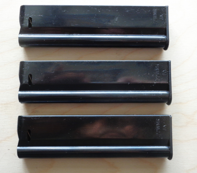 Gebe 3 Stück 10-Schuß-Magazine für das Heckler & Koch HK 300 ab. Kaliber .22 WMR, Herstellungsjahr JA = 1991. Magazine sind nie benutzt worden, lagen aber viele Jahre auf einer Filzoberfläche, weshalb sich auf der Rückseite leichte Rostpickel gebildet haben (siehe Bilder).