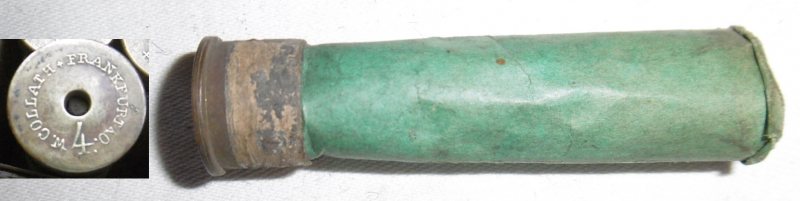 Angeboten wird 1 leere, ungebrauchte Collath-Schrothülse mit horizontaler Stiftzündung No.4, entspricht Kal.16. Variante mit dünner Papierhülse und weißem Pappe-Bodenstück. erhaben gestempelt: ( W.COLLATH FRANKFURT a.O 4 ) Fertigung vor 1928. Diese Hülse lagerte auf dem offenen Dachboden der Büchsenmacherei ERDELT in Neustadt/Haardt (Weinstraße). 100 Jahre haben eine Menge Schmutz hinterlassen, der noch nicht ganz entfernt ist.