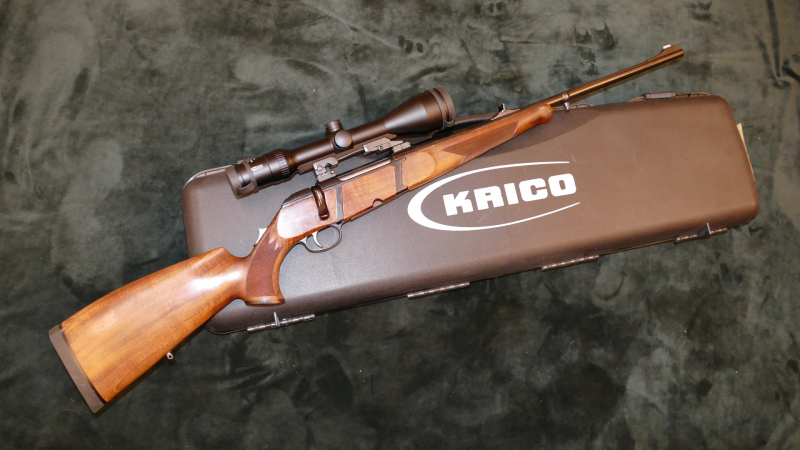 Krico Repetierbüchse Mod. 902, Kal. .30-06Spr., das Schloß wird mittels eines Schiebers gespannt, im entspannten Zustand ist die Kammer gegen versehentliches Öffnen gesichert. Rückstecher, per EAW-Schwenkmontage ist ein Meoüpta Meostar R1r 3-12x56RD/MR mit Leuchtabsehen 4 montiert, altersgemäß sehr guter Zustand, ganz leichte Gebrauchsspuren, Beschuß 2003. Schußleistung sehr gut, siehe Bild: 5 Schuß mit RWS 9,7g KS auf 100m. Lauf innen blank, Lauflänge 55cm, Schaftlänge 36cm, Gesamtlänge 108,5cm. Zu der Waffe wird der original Koffer mitgeliefert.