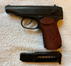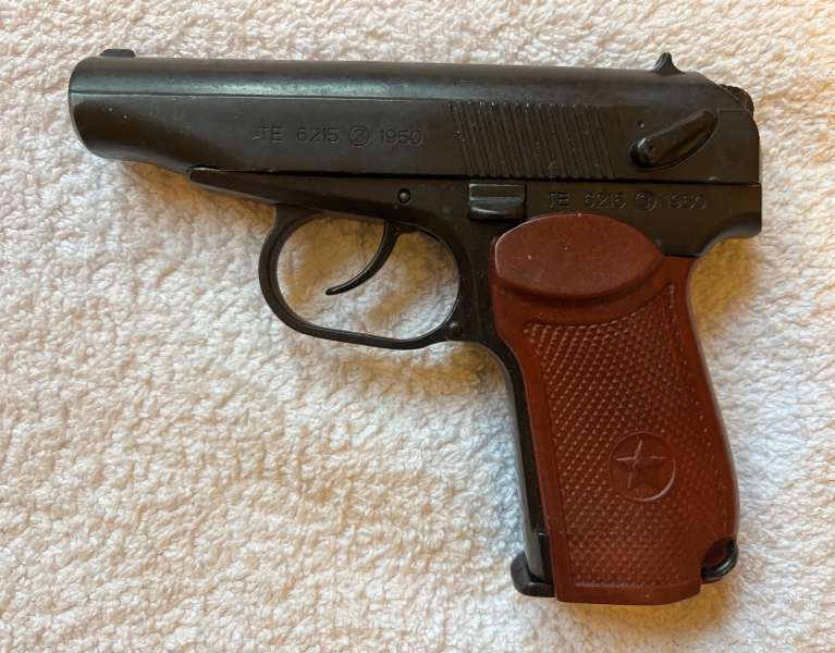 Zum Verkauf steht diese Deko-Waffe Pistole Makarow (auch Makarov) in Originalgröße. Das herausnehmbare Magazin ist mit dabei. Die Deko-Waffe kann man repetieren und abschlagen, die Abzugssicherung ist jedoch starr und nur angedeutet. Die Laufsperre liegt etwa in der Mitte des Laufes, 7 cm sind also vorn frei. Diese Deko-Waffe soll offenbar eine DDR-Makarow (Pistole M) mit Sowjet-Griffschalen darstellen. Der Hersteller ist mir nicht belannt. Es handelt sich hier lediglich um eine NICHT BESCHUSSFÄHIGE DEKO-WAFFE! Siehe Bilder.