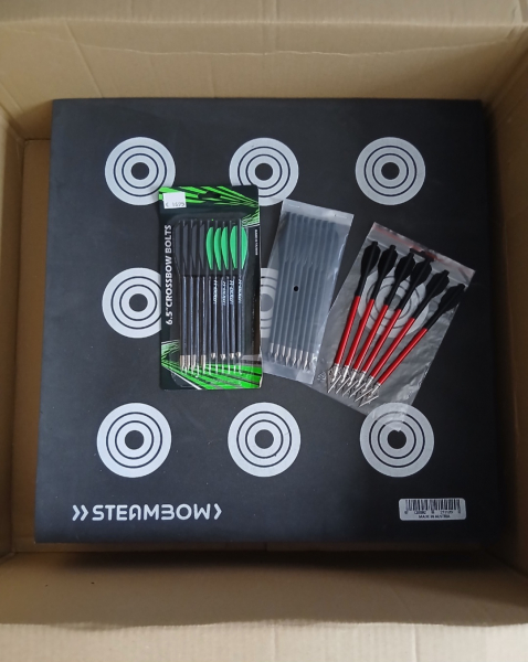 Steambow Pfeilfangmatte / Zielscheibe inklusive 27x Pistolenarmbrustbolzen 6,5Zoll. 4Stück X-BOW FMA High Range Carbon-Bolzen, 4Stück standart Kunststoff-Bolzen schwarz, 8Stück Bodkin Stahlspitzen Aluminium-Bolzen schwarz, 6Stück Broadhead Jagdspitzen Aluminium-Bolzen rot, 5Stück standart Gold Aluminium-Bolzen mit schraubbarer Spitze, und einen Sehnenwachs-Stift. DAS ZUBEHÖRSET BEINHALTET KEINE PISTOLENARMBRUST.