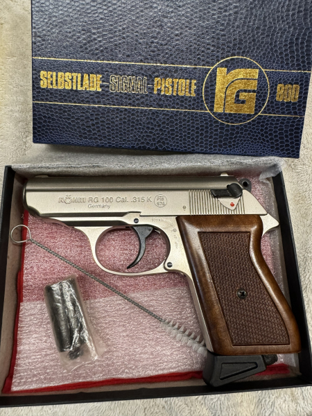 zum Verkauf steht eine Schreckschusspistole von Röhm RG 100 in der seltenen vernickelten Variante im Kaliber 315 Knall. Die Waffe stammt aus einer Sammlerauflösung und ist in einem sehr guten Zustand. Ich würde sagen wie neu. Mit dabei ist der Abschussbecher, die Anleitung und eine Reinigungsbürste. Die Verpackung ist eine originale Röhm, jedoch steht RG 800 drauf.