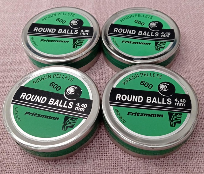 Zur Versteigerung kommen vier Dosen á 600 Rundkugeln im Kaliber 4,40 mm von Fritzmann für z.B. Haenel 310, 49a oder Anschütz 275.
