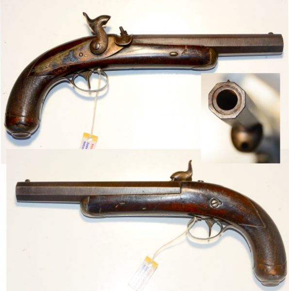 Französische Offizierspistole, keine Markierungen und kein Beschuss, Lauf unten Marke "verschlungenes JC", Lauflänge 20,3cm, Gesamtlänge 34cm, ursprüngliches Kaliber um 18,8 mm, im 19. Jahrhundert eingesetzter gezogener Lauf mit einen Kaliber von 12,5mm, guter Zustand mit Altersspuren