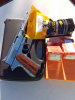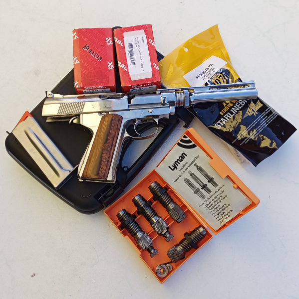 Es handelt sich um eine original Wildey Pistole in .475 Wildey Magnum in 8 Zoll nebst 100 neuen Hülsen von Starline, 100 neuen Geschossen von Hornady sowie einen unbenutzten Matrizensatz von Lyman.