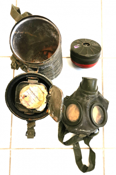 Sie bieten auf eine Gasmaske mit Dose kompl. Gasmaske hat ähnl. wie I und II WK . Denke BW 1. Ausführung.