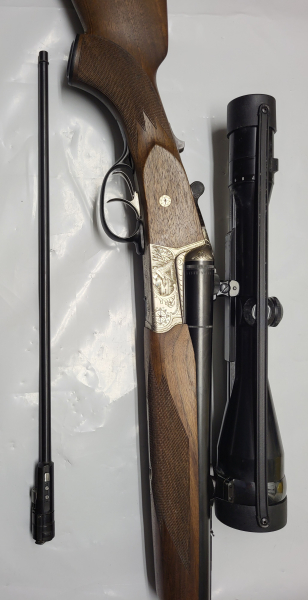 Sie bieten auf einen Drilling der Fa. Krieghoff im Kal. .30/06, Schrotläufe 12/70, mit Orig. Krieghoff Einstecklauf .22Magn., vord. Abz. Rückst.
