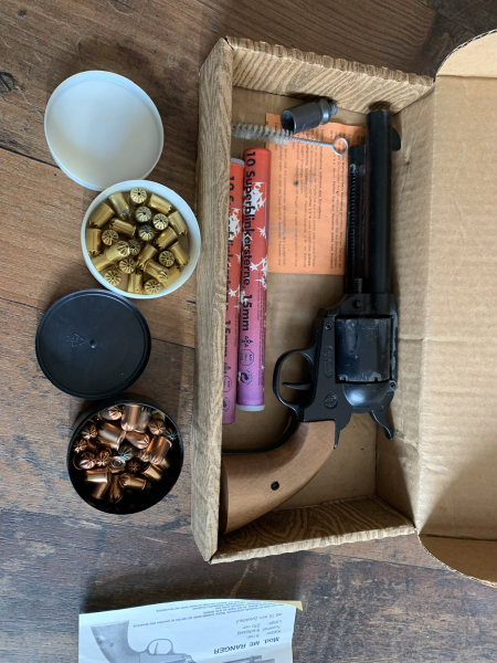 Älterer Schreckschussrevolver. Funktioniert. Mit Abschussbecher, 2 Schachteln Munition und 2 Stangen Leuchtkugeln. 9mm