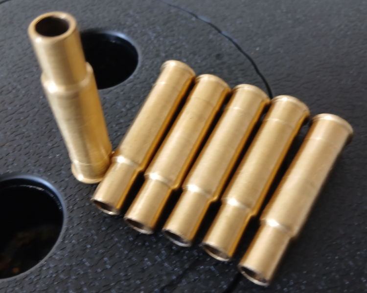LEP Hülsen / Pufferpatronen / Übungspatronen, 6 Stück, für den SAA - Single Action Army 5,5mm. 22 Revolver. Messing poliert, sehr gut verarbeitet. 42mm Länge mit durchgehender 5,5mm Bohrung. Für abgeschlagene 209 Primer. Das verschießen von Munition (z.b Diabolos, Rundkugel) mit heissen Gasen, ist in Deutschland nicht gestattet.