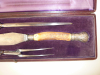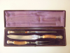 Verkaufe aus dem Nachlass meines Vaters ein wunderschönes, antikes, jagdliches Tranchierbesteck-Set / Vorlagebesteck mit Hirschhorngriffen. Hersteller müsste MAPPIN & WEBB CUTLERS SHEFFIELD & LONDON sein – Angabe jedoch ohne Gewähr! Ich habe im Netz ein sehr ähnliches Set gefunden welches auf diesen Hersteller schließen lässt. Das 3-teilige Set mit Messer, Gabel mit herausklappbarer Ablage und Wetzstahl befindet sich in der Geometrie exakt eingepasst in der originalen Schatulle. Die versilberten Beschläge sind reich und wunderschön verziert gearbeitet. Das Set stammt der Aufmachung und Wertigkeit nach vermutlich aus Adelsbesitz. Schatulle mit violetter Satin- und Samtauskleidung, intakt. Zustand dem Alter entsprechend sehr gut. Teile sauber und nicht aufgearbeitet. Die Fotos sind Teil der Artikelbeschreibung. Weitere Fotos auf Wunsch. Fragen bitte vor Gebotsabgabe stellen. Verkauf von privat unter Ausschluss jeglicher Gewährleistung. Bieten sie nur wenn sie damit einverstanden sind. Versandkosten (DHL-Paket versichert) innerhalb BRD ohne Inseln. KEIN AUSLANDSVERSAND!