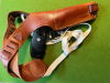 klassisches Schulterholster Rechtshand, Träger innen aus weichem, bequemen Wildleder mittels Lederschnuren einstellbar und stufenlos einstellbare Schlinge aus Gummiband, geschlossen am Lauf, und als reiner Schnellzieher ohne weitere Sicherung als die innen verbaute Stahlklemme gestaltet.