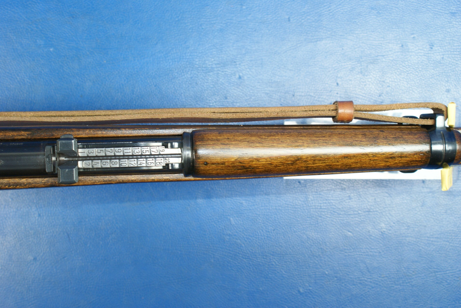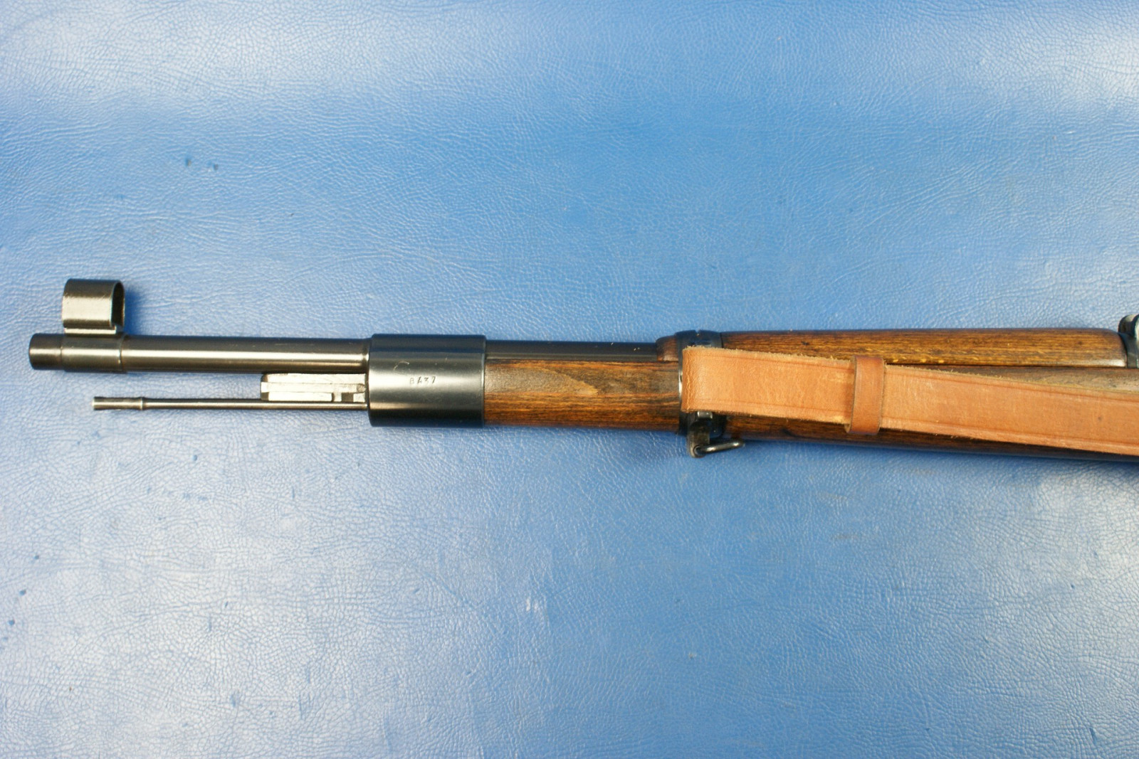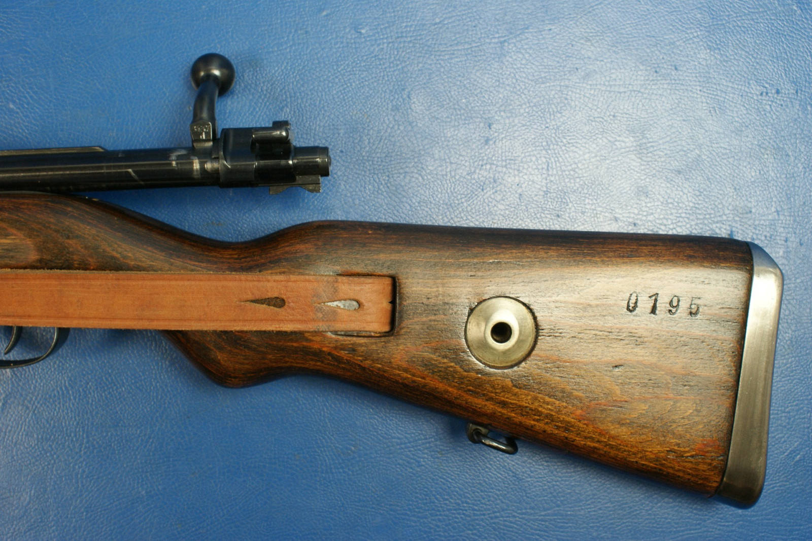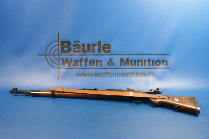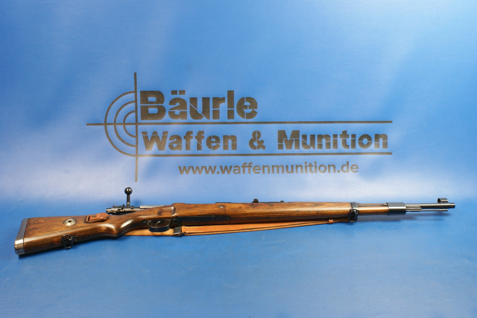 Lager- und Gebrauchsspuren. Magazindeckel und Abzugsgehäuse evtl. Korrekturgestempelt. Riemen ist eine Reproduktion. Waffe ist überarbeitet worden.