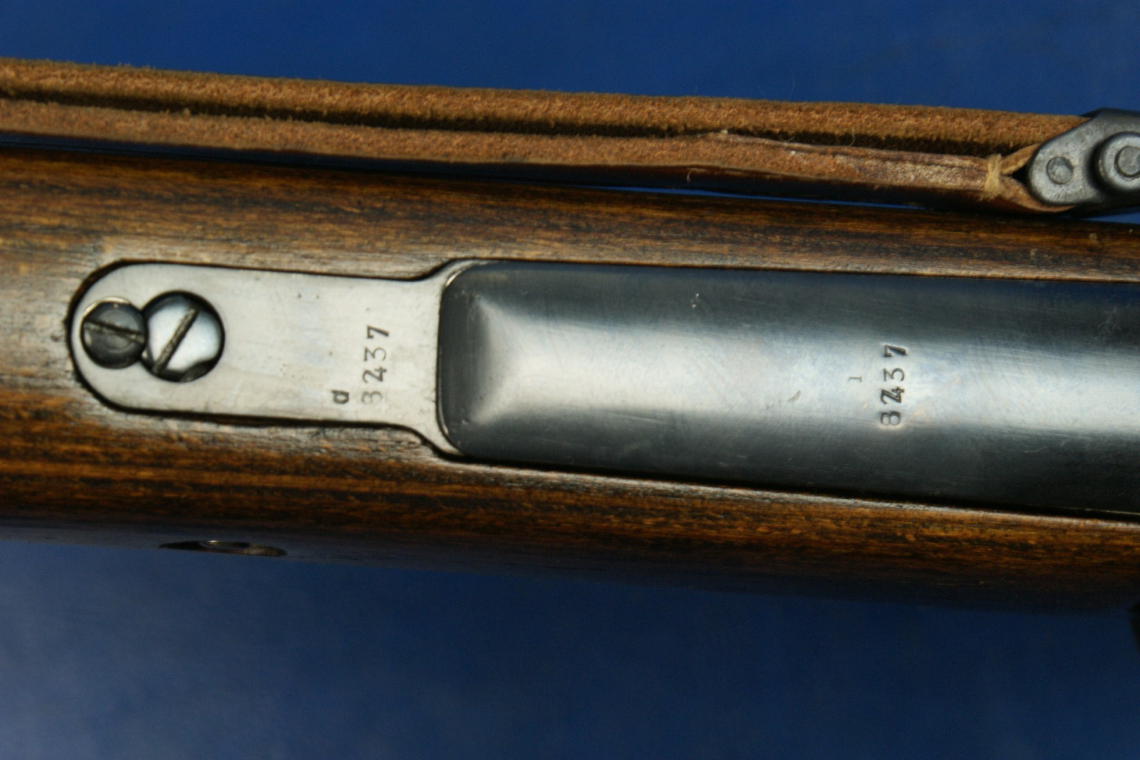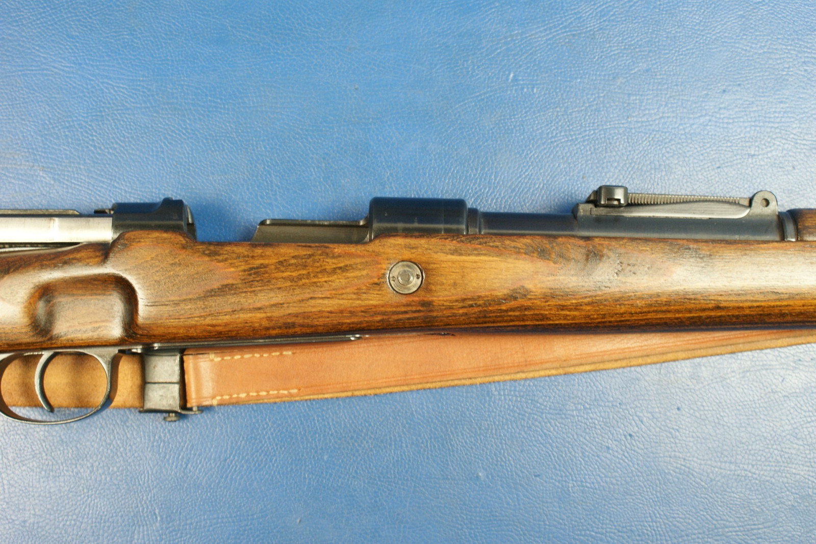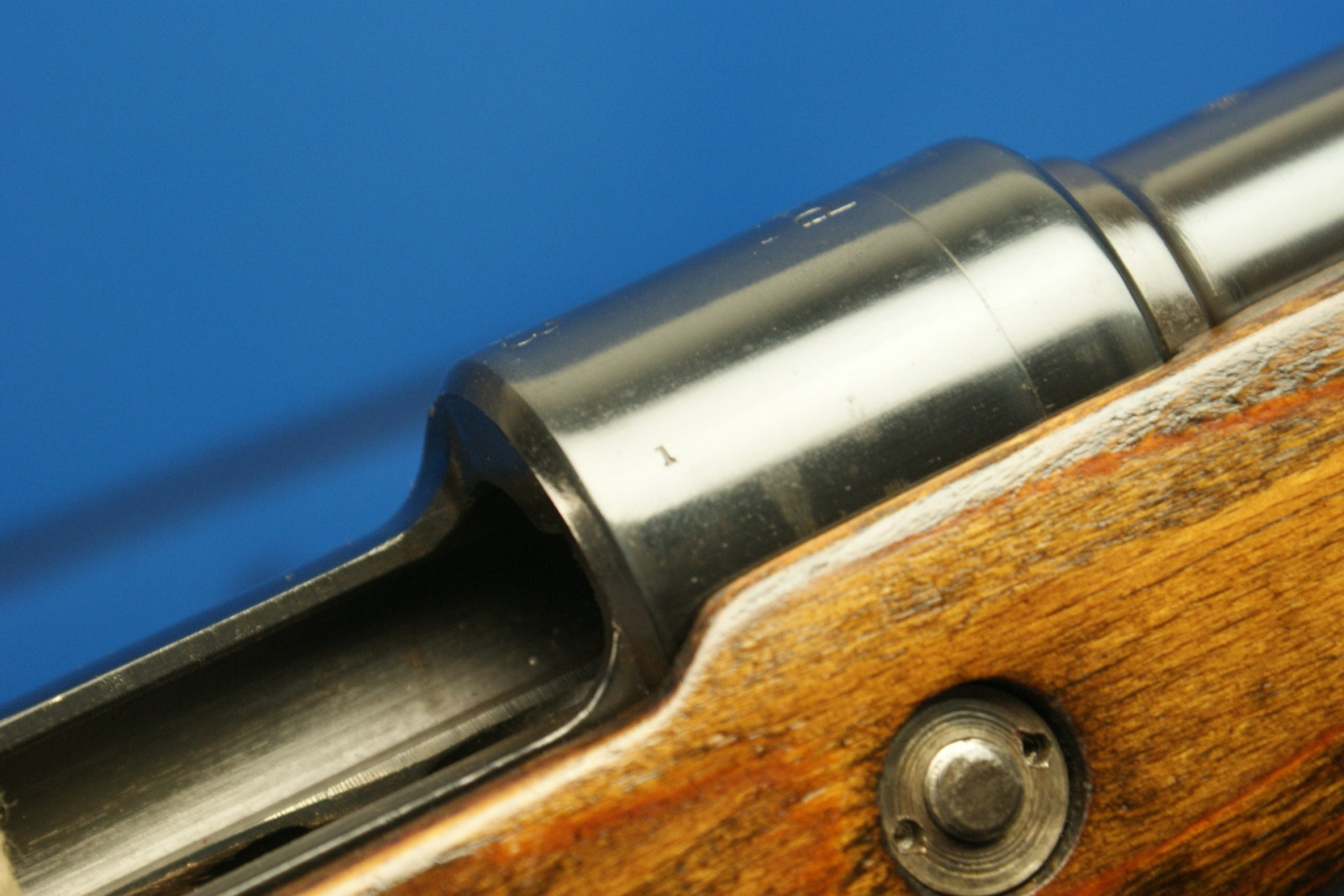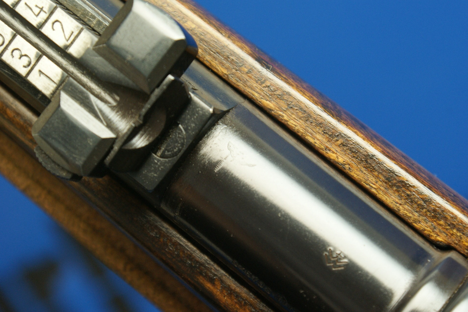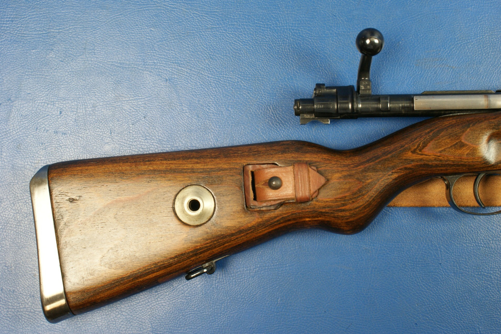 Lager- und Gebrauchsspuren. Magazindeckel und Abzugsgehäuse evtl. Korrekturgestempelt. Riemen ist eine Reproduktion. Waffe ist überarbeitet worden.