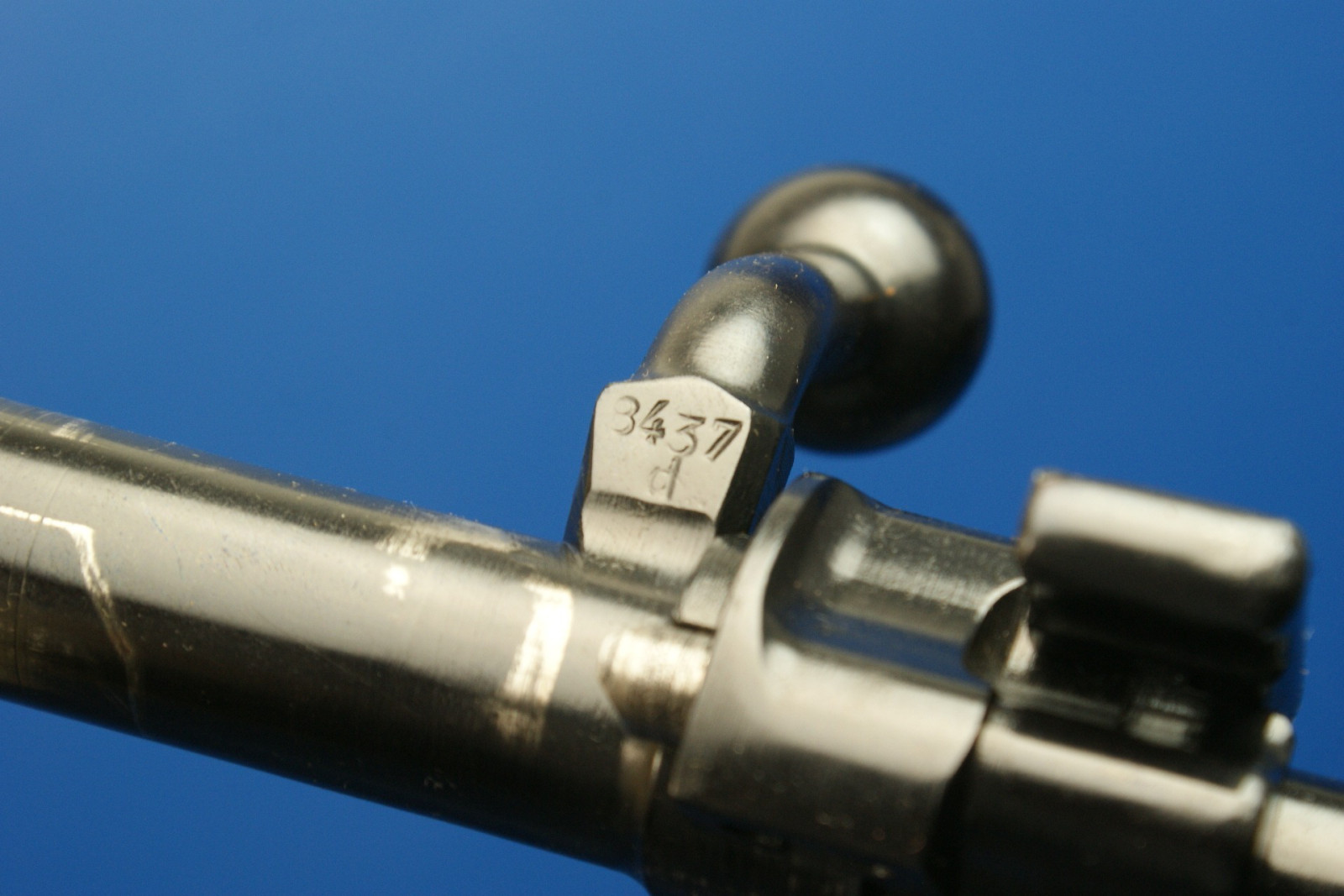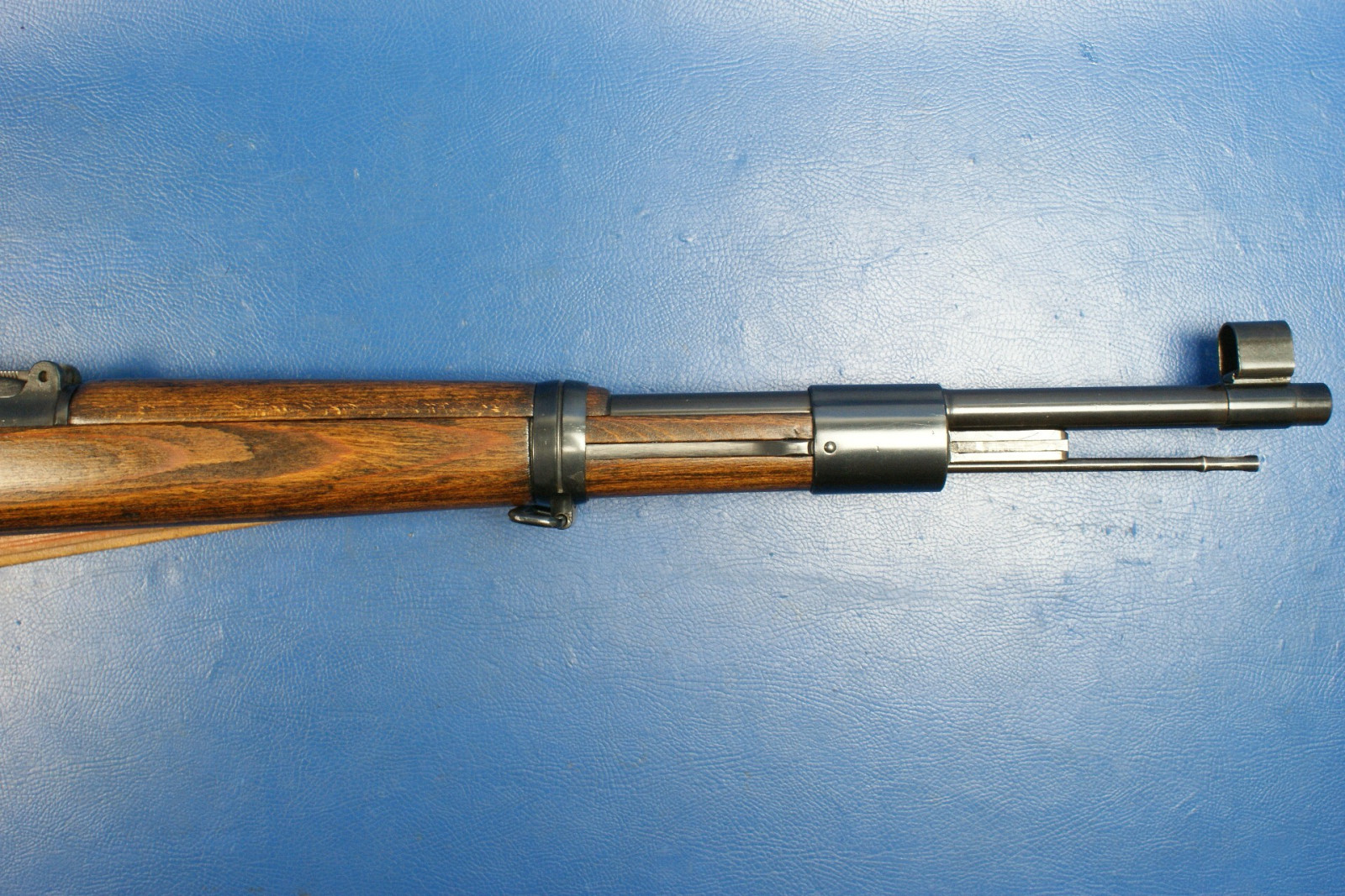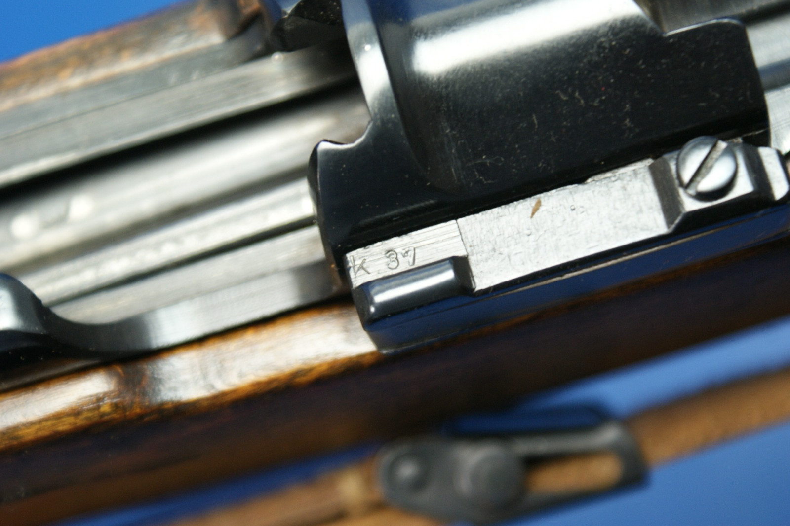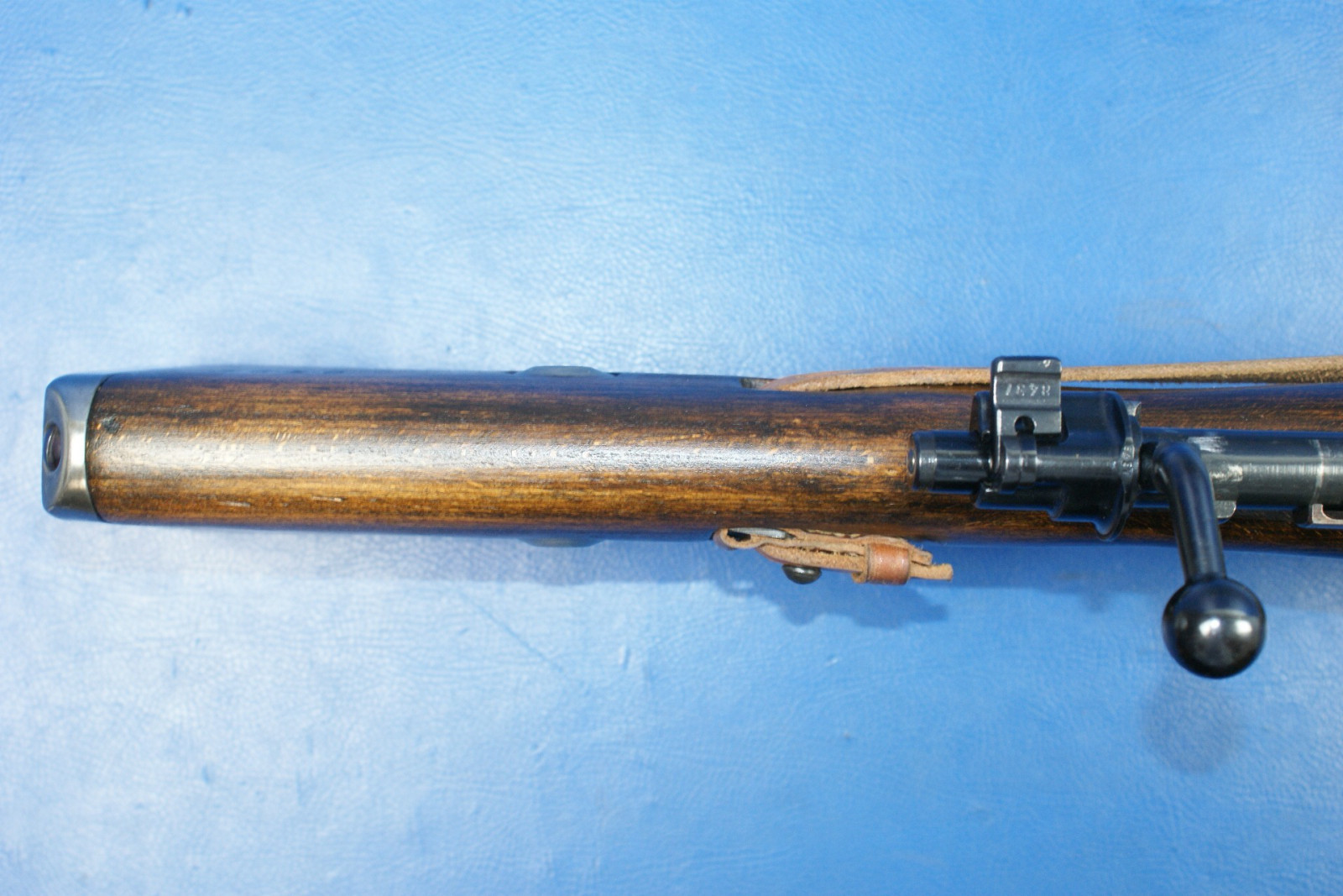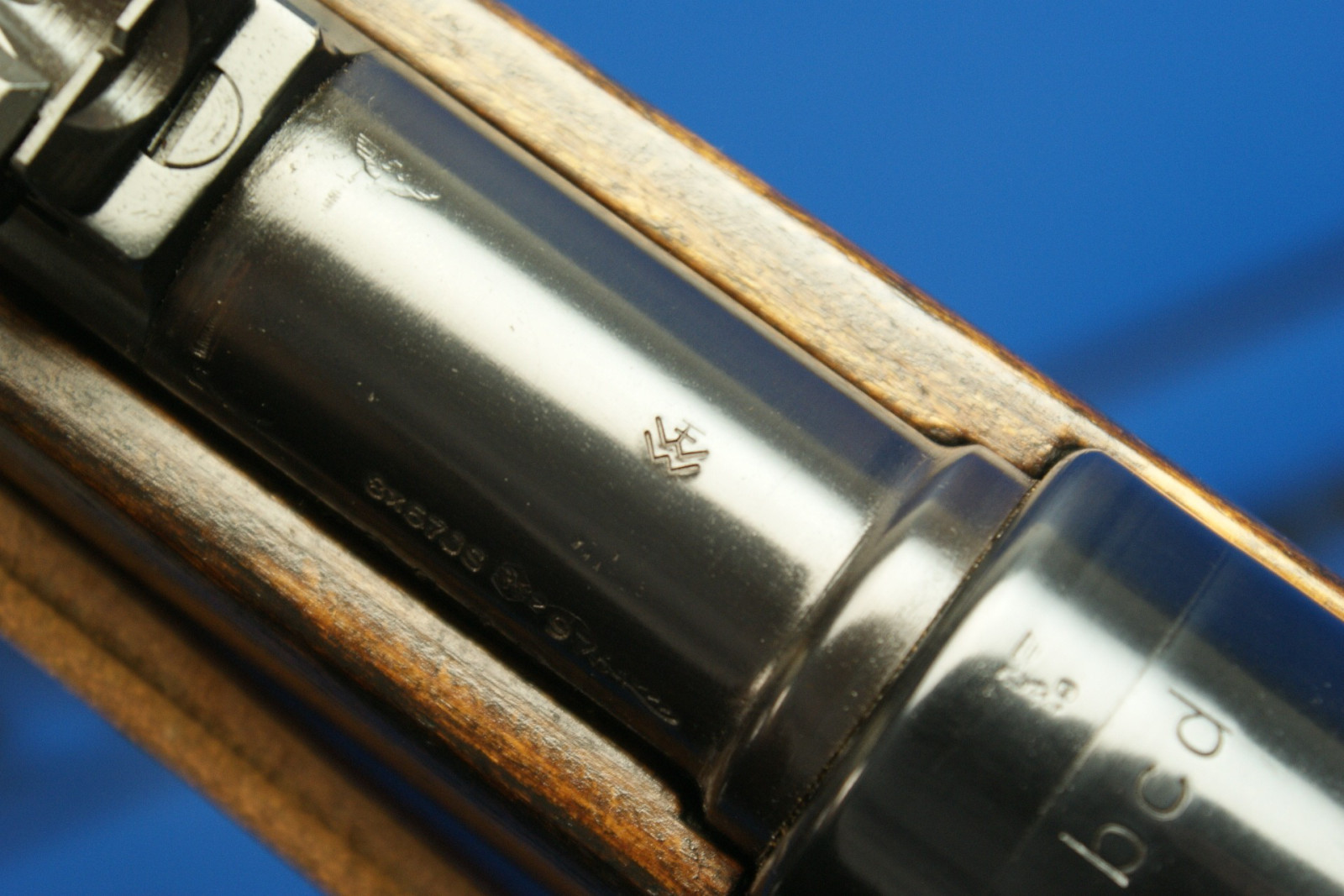 Lager- und Gebrauchsspuren. Magazindeckel und Abzugsgehäuse evtl. Korrekturgestempelt. Riemen ist eine Reproduktion. Waffe ist überarbeitet worden.