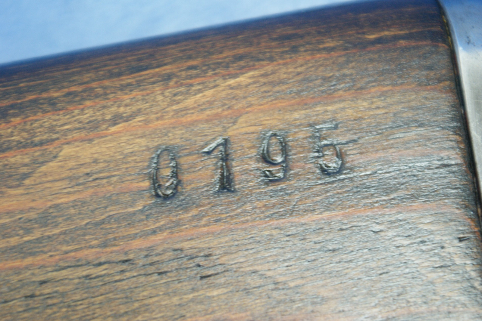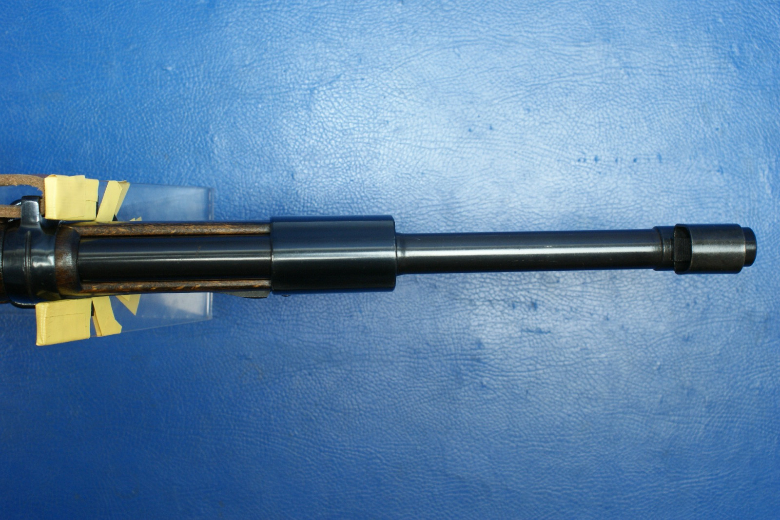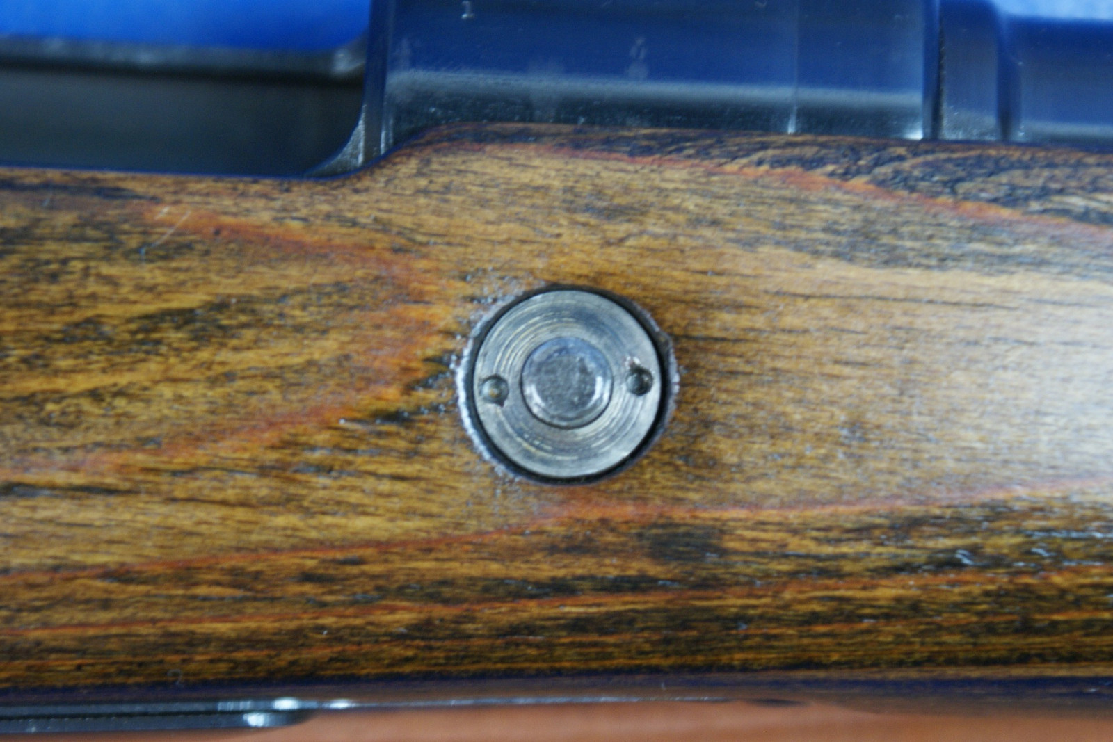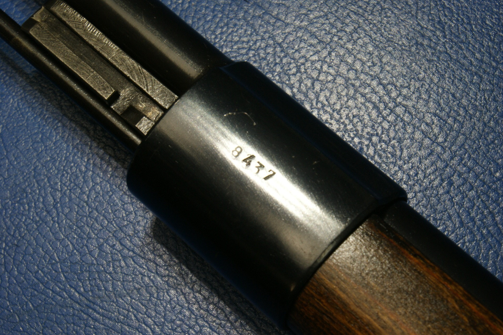 Lager- und Gebrauchsspuren. Magazindeckel und Abzugsgehäuse evtl. Korrekturgestempelt. Riemen ist eine Reproduktion. Waffe ist überarbeitet worden.