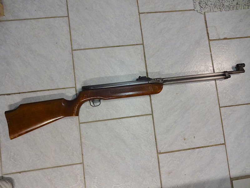 Schweres Gewehr mit Seitenspanner in 4,5 mm Diabolo, gezogener Lauf. Schuss löst nur schwerlich aus. Starke Gebrauchsspuren. F-Zeichen Variante. Privatverkauf.