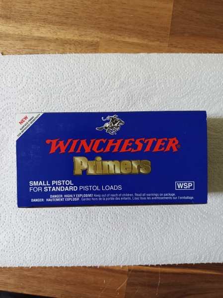 Biete hier 1000 Small Pistol Zündhütchen von Winchester an. Wurden stets perfekt gelagert! Die Zündhütchen sind neu, nur die Verpackung hat leichte Lagerspuren, siehe Bilder. Ich benötige bitte nach Ende der Auktion einen Altersnachweis, auch von ID-Mitgliedern.