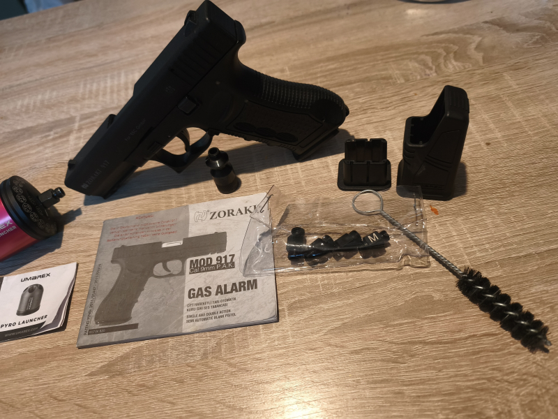 Zoraki 917 in schwarz mit Zubehör. Ca 120 Schuss hat sie gesehen wurde danach aber immer gereinigt. Zubehör enthält: Anleitung, Pyroaufsatz, Ladehilfe, Reinigungsbürste.