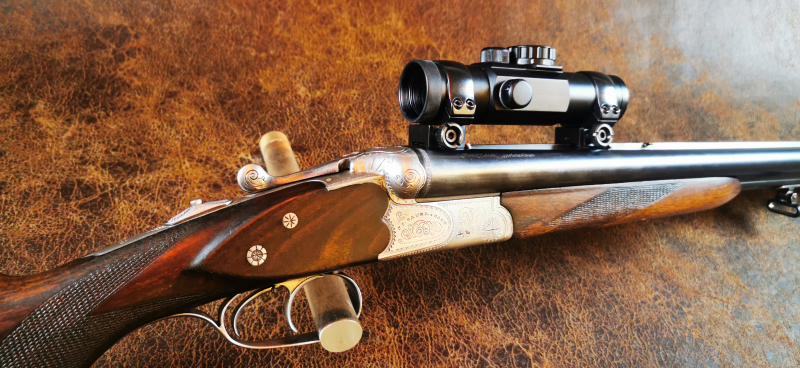 Mit Beschuss. Multi Reticle Rotpunkt auf Prismenmontage. Choke: 1/1+1/2.