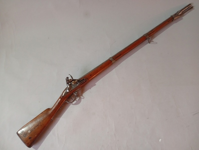 Französisches Steinschlossgewehr Modell 1777-An IX. Aus der königlichen Manufaktur von Versailles Runder Lauf mit Gewehrkapsel, datiert 1816. Verschluss mit Prägung „Me 1777”. Schlosstafel mit der Prägung „Mre ROYALE DE VERSAILLES” und rundem Hahn. Beschläge aus gestempeltem Eisen. Nussbaumschaft mit zahlreichen Brandzeichen und Stempel „PDL”. Eisenstock. Gesamtlänge: 137,5 cm. Kaliber 18 mm. Guter Zustand. Für Angebote, Informationen oder zusätzliche Fotos stehe ich Ihnen gerne zur Verfügung.