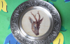 hochwertige alte Wanddekoration aus 2 alten Zinntellern und 3 Gehörnen