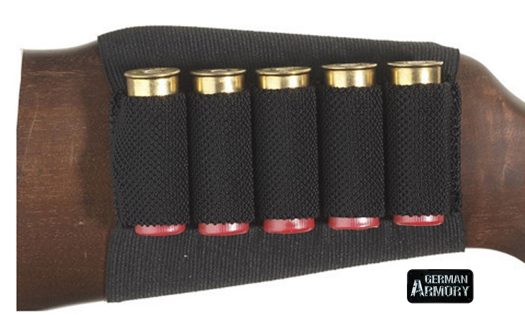 5-fach Schrotpatronenhalter für Gewehrkolben. Besteht aus dehnfähigem Material, wird einfach über das Ende des Kolbens geschoben. Für Kaliber 12, 20 und 16, alle Patronenlängen.