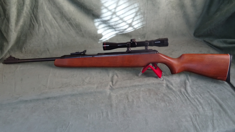 Gebrauchtes Seitenspanner Luftgewehr von Diana, Mod.48/52, F-Variante, im Kaliber 4,5mm/.177. Luftgewehr mit guter Leistung. Einzellader, mit automatischer Sicherung. Brünierung gut Zustand 2, kein Rost. Lackierter Buchenschaft, Schaftspitze wurde erneuert. Verstellbare Visierung und Zielfernrohr 4x32. Lauflänge ca. 43cm, gesamt ca. 108 cm.
