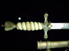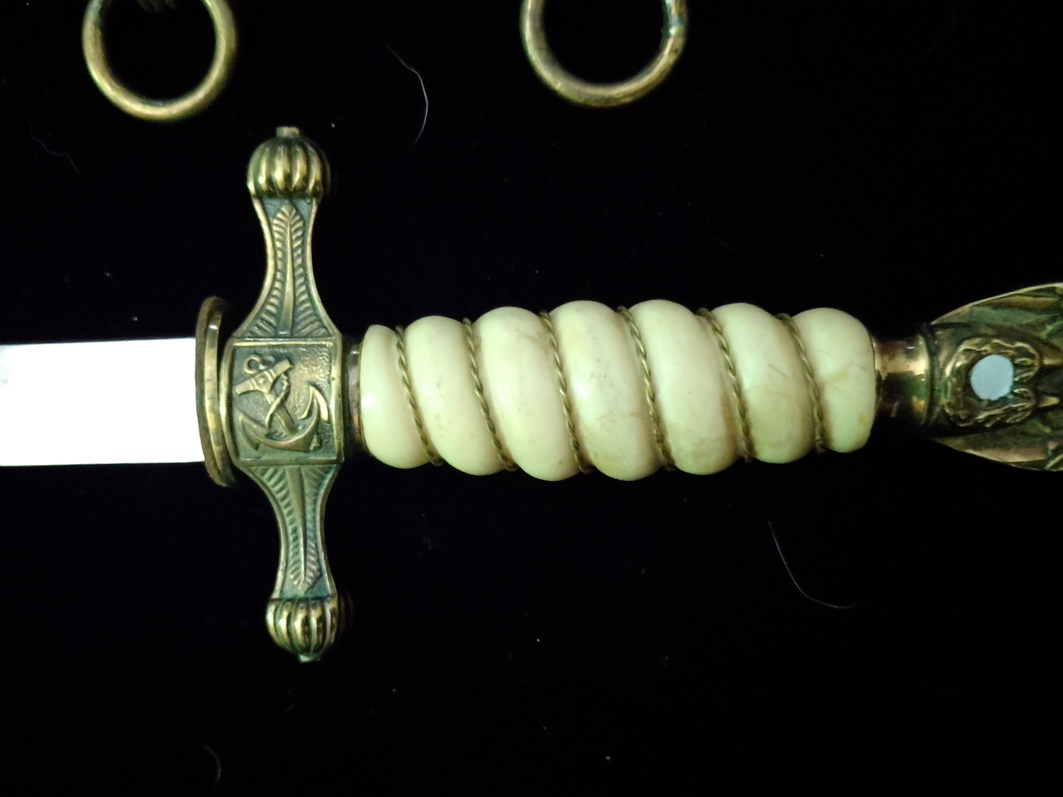 Messing Montur mit Trolongriff dieser mit feiner Drahtwicklung, Drücker intakt, doppelseitige Ätzung auf der Klinge, Vorderseite maritime Symbole und ein Adler, rückseitig ein Schlachtschiff oder Zerstörer, gehämmerte Scheide mit aufgesetzten Bändern , die Scheide ist ringsherum.gehämmert.