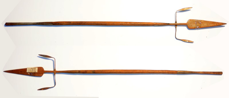 Afrikanischer Fischspeer, um Neunzehnhundert, Klingenlänge 21 cm, am Stabende ebenfalls Metallklinge, Gesamtlänge 61,3 cm, Metall leicht flugrostig