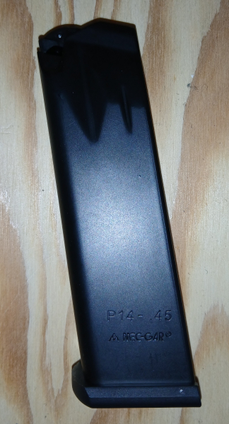Zum Angebot kommt ein minimal gebrauchtes aber noch gut erhaltenes und voll funktionstüchtiges Pistolenmagazin der Marke "MEC-GAR" für eine Para Ordnance Pistole P14-45 im Kaliber .45ACP mit einem Fassungsvermögen für 14 Patronen, hergestellt in Italien.