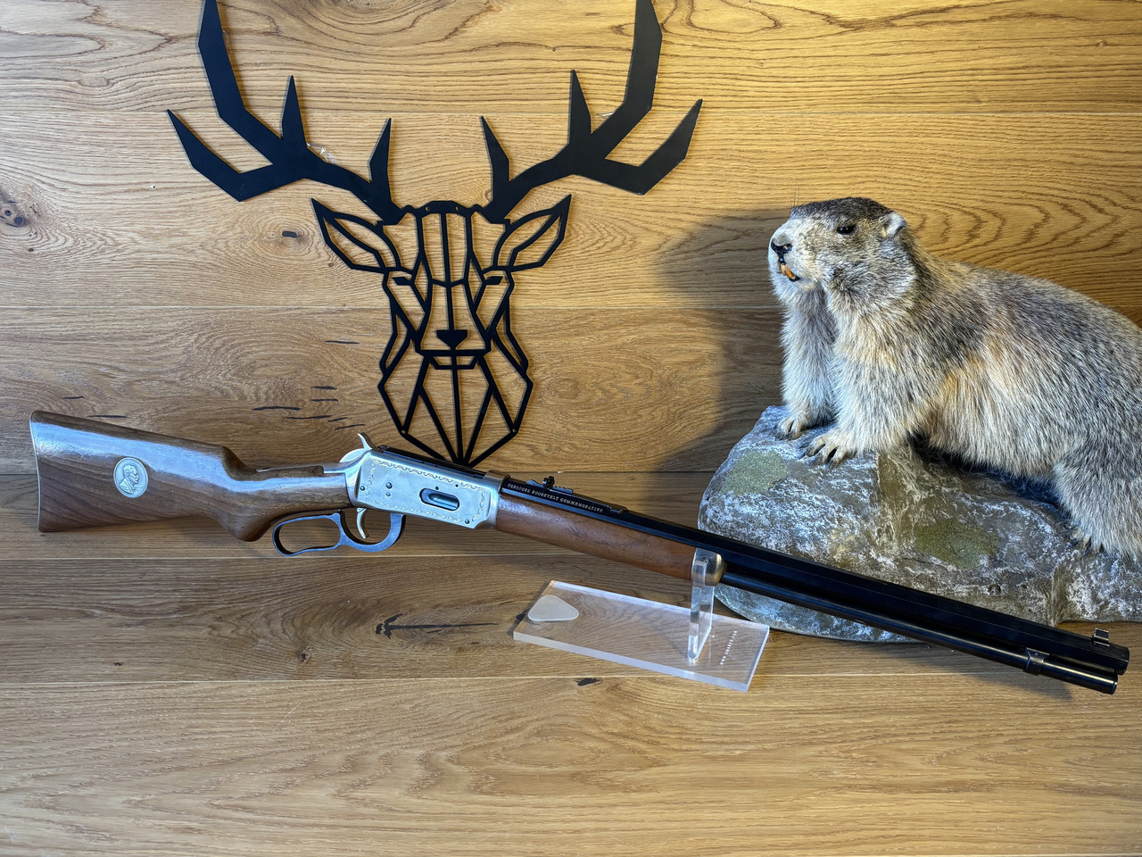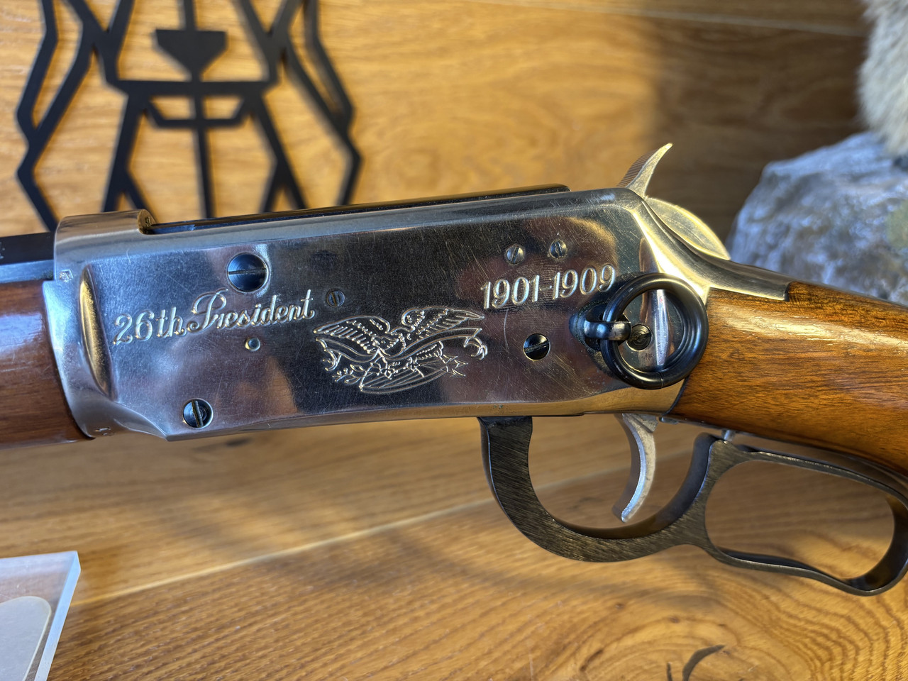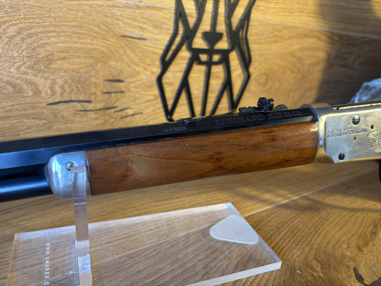 Kaliber: .30-30 Win Model: 94 Lauflänge: 20" (51cm) Baujahr: ca. 1969 Buckhorn Visierung Jubiläumsbeschriftung „26th President 1901-1909“