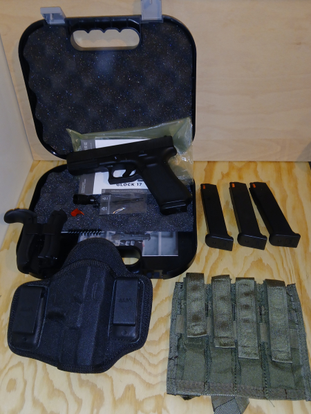 Zum Angebot kommt eine gebrauchte aber noch gut erhaltene und voll funktionstüchtige Schreckschusspistole von Umarex, Modell Glock 17 Gen 5 SV also mit Stahlverschluss mit der PTB Nr.: 1068, inklusive Originalkoffer mit Zubehör, sowie drei Ersatzmagazinen, einem AKAR Innenbundholster zum verdeckten Tragen und einer Vierfach-Magazintasche auf Mollebasis von Paraclete.
