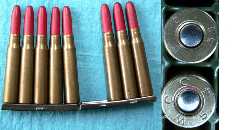 Aus Restbeständen der US Armee wurden Patronen und Patronenhülsen Kal. 30-06 für die Umformung auf 8x57 verwendet.