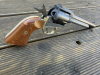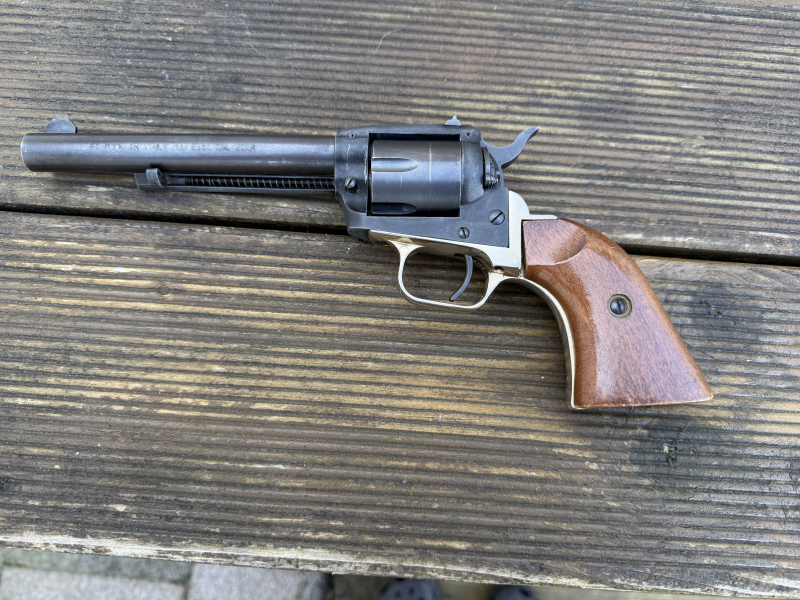 Tangfolio Revolver Modell E151, Nr.:E46775, Lauflänge: 6", einschüssig, Single Action Only, seitenverstellbares Visier, glatte Holzgriffschalen, gebraucht, guter Erhaltungszustand, Gebrauchsspuren, die Metallteile mit leichten blanken Stellen, Griffschalen mit leichten Gebrauchsspuren, kann auf gelbe WBK eingetragen werden, 1 Kammer offen alle anderen zu.