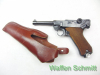 Sie bieten auf eine halbautomatische Pistole Mauser P08 1940 im Kaliber 9mm Luger mit WaA-Stempelungen auf allen wesentlichen Teilen. Nummerngleich, Lauf von innen ohne Mängel, Kniegelenk-Verschluß, seitliche Sicherung, braune Holzgriffschalen. Inklusive braunem Holster. Original-Zustand!!!