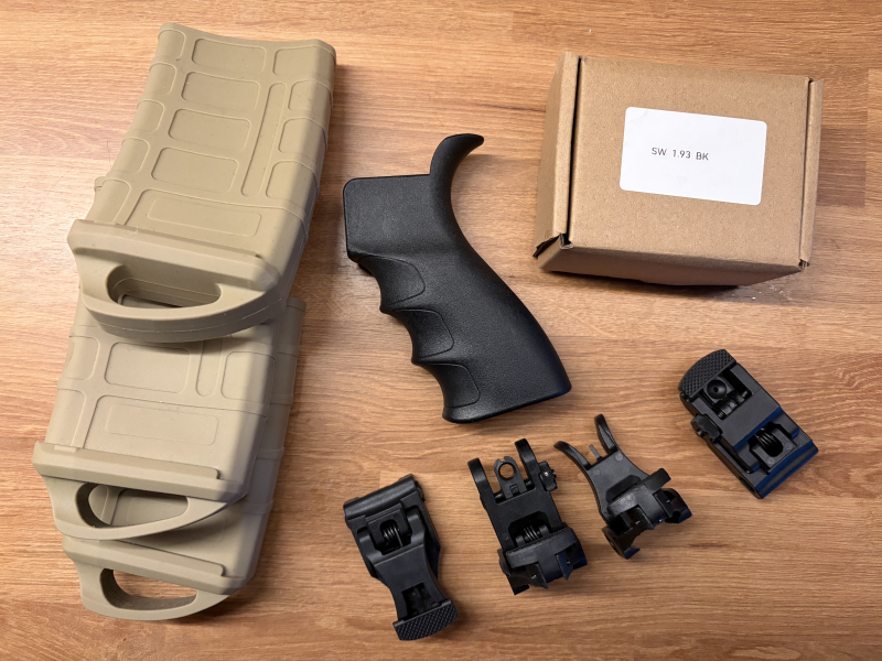 Wie auf den Bildern zu sehen. 2x Flip , 2 x Aimpoint Riser. 3 x Mag Hülle 1 x Grip