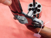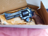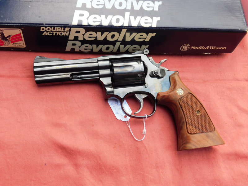Revolver von S&W Modell 586-3 in der 4 Zoll Ausführung Kal. 357 Magnum, 6 Schuss Trommel, verstellbare Visierung, L Rahmen. Lauf innen spiegelblank und Profil scharf. Timing und Abzug sind super. Die Waffe hat meiner Meinung nach fast keine Gebrauchsspuren. Gültiger Beschuss vorhanden. Mit original Verpackung. Schrift goldgelb eingelassen! Original Holzgriffschalen.