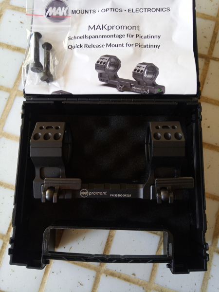 Verkaufe eine Schnellspannmontage von MAK für Picatinny, Modell promont, für Rohrdurchmesser 34mm, 0 MOA Vorneigung, Bauhöhe 21mm. War nur einmal ungeklebt montiert. Habe das Glas verkauft u. brauche sie deshalb nicht mehr. Hat höchstens minimale Gebrauchsspuren, mir sind keine aufgefallen, siehe dazu auch die Bilder. Kommt in der originalen Plastikbox. UVP ist 399.- €. Versand per versichertem DHL-Paket. Privatverkauf ohne Garantie, Gewährleistung o. Rückgabe.