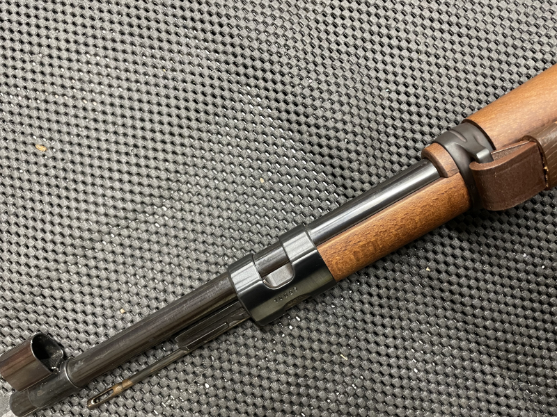 Waffe besetzt einen neuen Schaft und die Metallteile wurden leicht überarbeitet und neu brüniert. Orginalstempel sind alle gut erkennbar. Lauf spiegelblank mit scharfen Zügen und Feldern. Brünierung neu. Schaft keinerlei Macken oder Dellen. Gewehrriemen ebenfalls neu (aber wie orginal gefertigt und befestigt). Komplett nummerngleich bis auf Auszieher. Kornschutz vorhanden.
