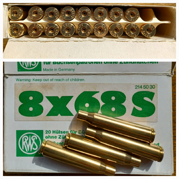 Zur Auktion kommen Hülsen im Kaliber 8x68 S aus dem Nachlaß eines Jägers. Es sind 17 Stück ohne Zündhütchen von dem Hersteller RWS. Habe sie gereinigt da sie etwas angelaufen waren. Innen noch blank , keine Schmauchspuren. Meiner Meinung nach sind die Hülsen in einem ungeschossenem Zustand. Näheres kann ich nicht sagen. Den Rest entnehmen Sie dem Foto . Es ist keine Neuware . Bei Fragen einfach melden. Da Privatverkauf, keine Garantie, Gewährleistung, Umtausch oder Rücknahme.