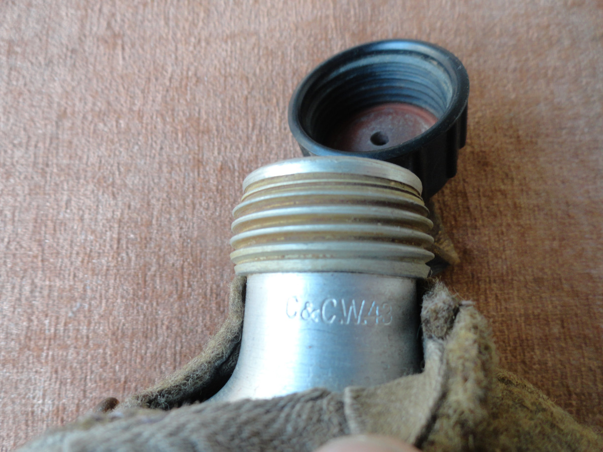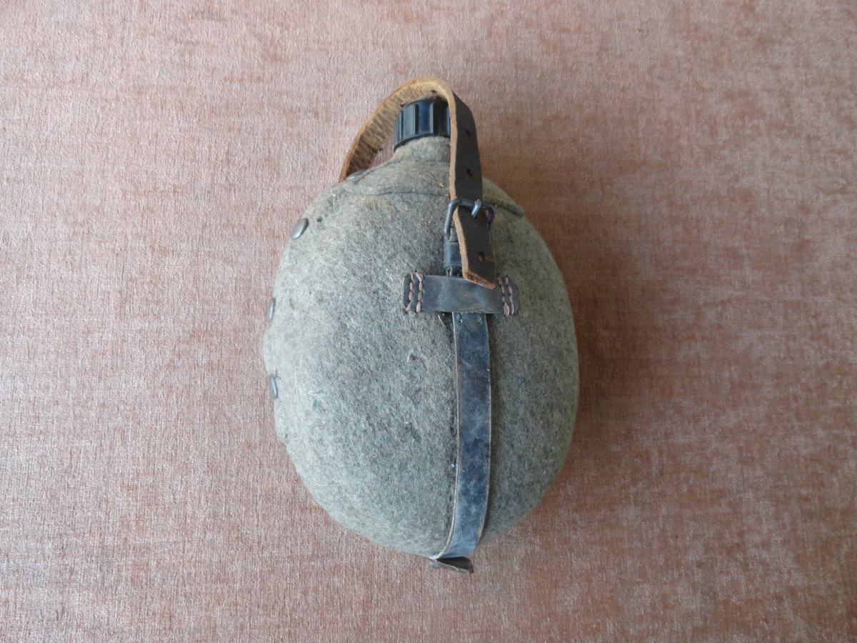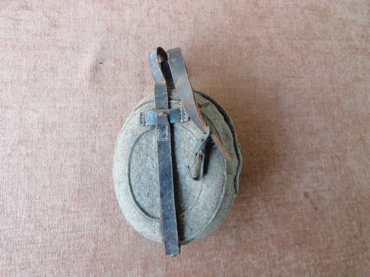 Feldflasche aus dem 2. Weltkrieg am Flaschenhals gestempelt, Beriemung schadhaft das ganze mit Alters und Gebrauchsspuren.