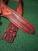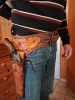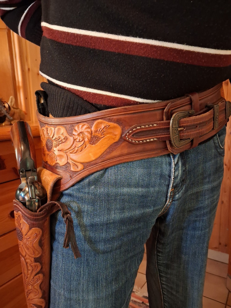 Das Westernholster ist in Handarbeit gefertigt worden, von sehr guter Lederqualität und wenig benutzt worden. Gürtelumfang vom ersten zum letzten Loch ca. 96-107 cm. Es passen Revolver wie der abgebildete HS mit 7,5 Lauflänge aber auch Vorderlader wie Remington, Colt Army 1860 und Navy 1851. Das Holster ist wohl für die Vorderlader gedacht da es keine Patronenschlaufen hat, aber die klassischen Peacemaker-Revolver, wie eben der abgebildete HS- SAA passen ebenso gut rein.------Der Revolver gehört nicht zu der Auktion und dient nur zur Anschauung der Passung im Holster-----Es wird nur das Holster mit Gurt angeboten------