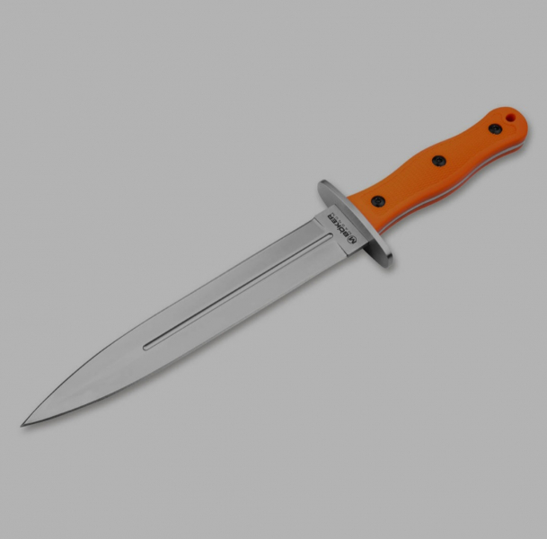 Zuverlässige Vollerlkonstruktion mit breiter Edelstahl-Parierstange. Zweischneidig geschliffene Klinge aus rostfreiem Edelstahl 440C. Robuste Nylonscheide mit Gürtelschlaufe und Druckknopfriegel.