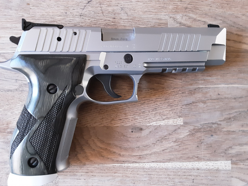 SIg Sauer X-Five in 9x19 aus deutscher Produktion. Hab ich vor 2 Jahren von einem Bekannten übernommen, der die Karte abgeben musste, weil er nicht schiessen war. Er hatte kurz nach dem Kauf einen Pflegefall in der Familie und konnte somit nicht mehr auf den Stand. Ich hab damit noch 1000 Schuss gemacht. Verkauf wegen Hobbyaufgabe.