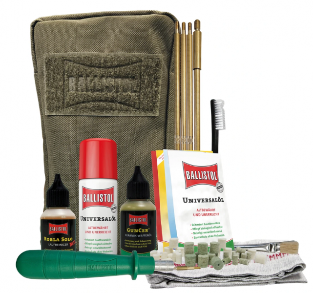 Drei Hochleistungs-Pflegemittel: Ausgestattet mit dem bewährten Ballistol Universalöl, dem GunCer Keramik-Waffenöl für extreme Belastungen und dem Robla Solo MIL Laufreiniger gegen hartnäckige Metallablagerungen.