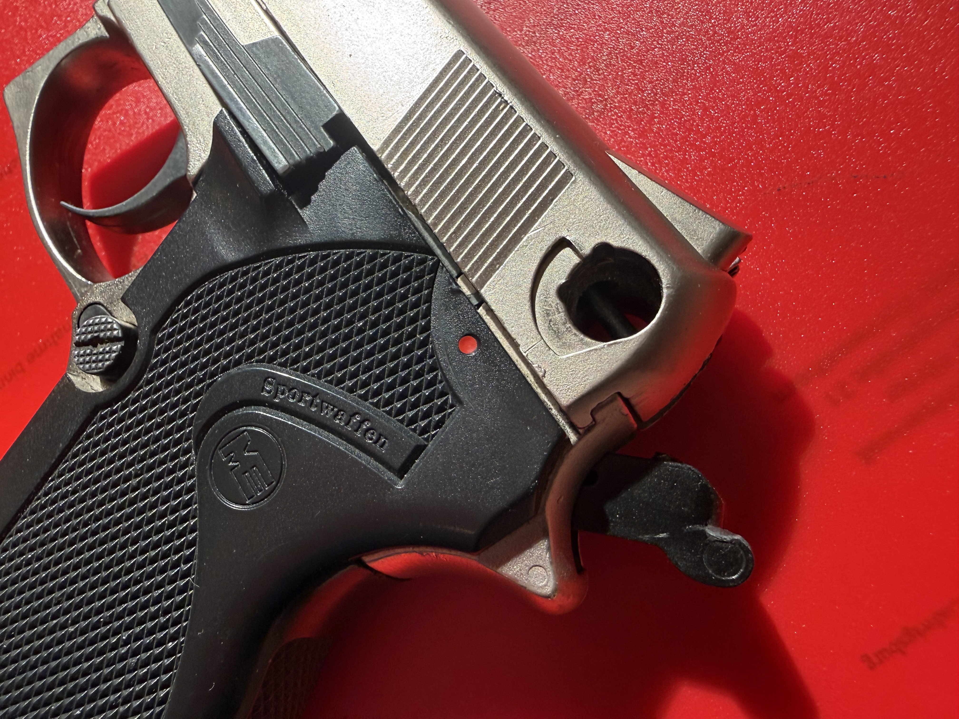 Nachlassfund:Pistole Kal.9mm P.A. Knall, ME-Sportwaffen,Solingen,Made in Germany,PTB 679,ME 69 mod.Springfield, Pistole sieht aus wie ungeschossen wird aber ausdrücklich als DEFEKT und Ersatzteilspender verkauft, Sicherungswalze hinten fehlt,Schlitten schwergängig.Funktion nicht gegeben bzw. nicht getestet---Zustand siehe alle original Bilder.Versand nur versichert mit DHL und Sendungsnachweis