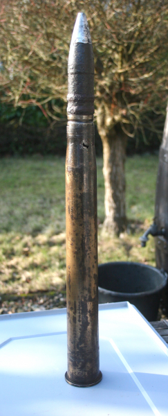 Ein paar kleine Löcher im oberen Bereich. Für einen Bodenfund gar nicht so übel. Die Stempelung am Boden der Hülse ist noch Lesbar.