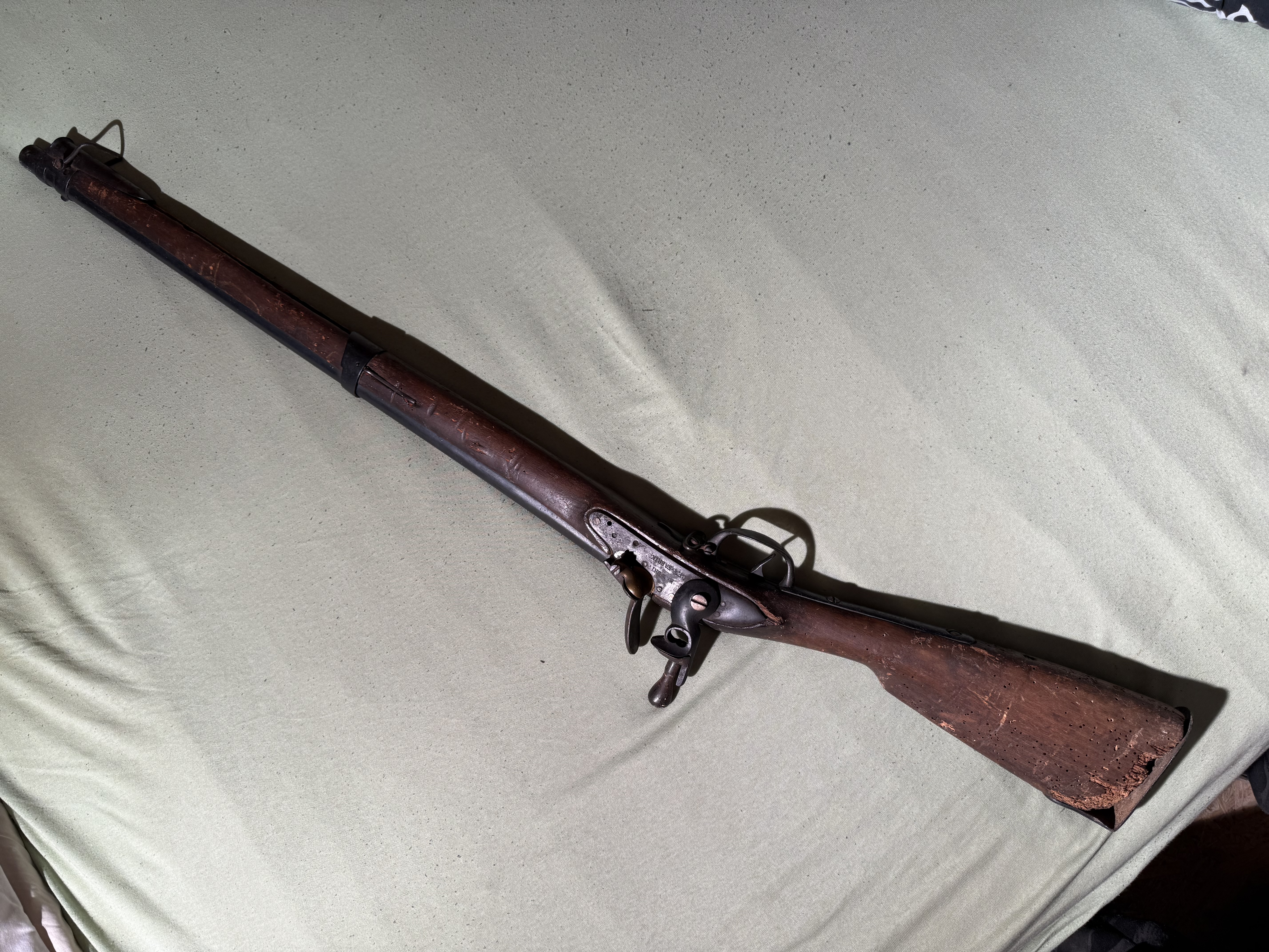 Viele ursprüngliche Steinschlossgewehre wurden im 19.Jahrhundert auf Perkussion umgebaut,weshalb Originale sehr selten sind,das hier ist ein echtes Originales-kein Repro,kein Nachbau,kein Umbau.Ein Original-Relikt vergangener Zeiten-siehe alle original Bilder,Gewehr im unverbasteltem Fundzustand mit Patina und verottetem Holzschaftende.